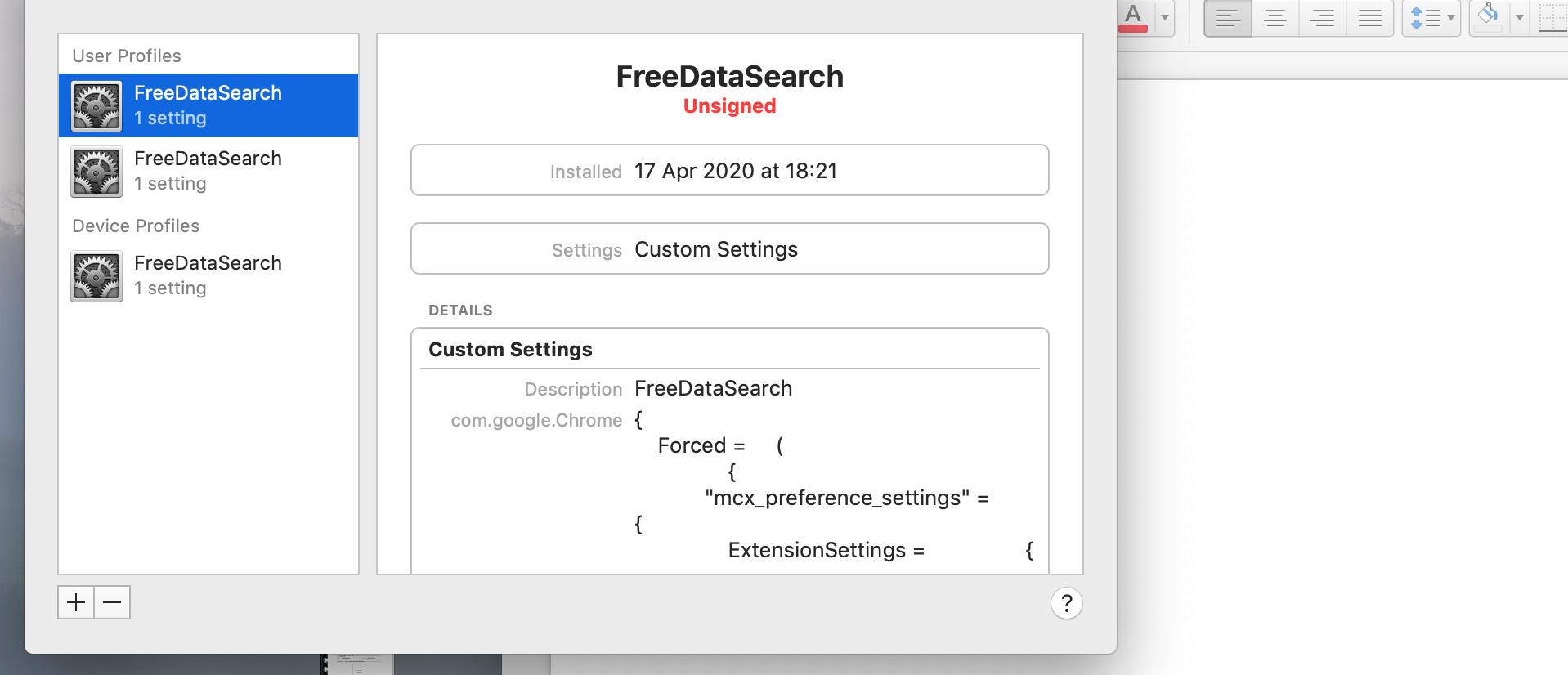 I seem to have 2 'USER PROFILES' both identified as Freedatasearch & 1 "DEVICE PROFILE' identified as Freedatasearch - do you delete all 3?