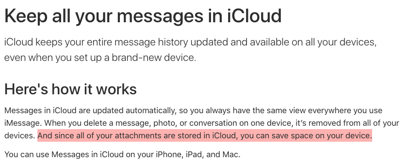 My daughter has more than 17gb of iMessage texts saved on her iPhone memory. She has 50gb of iCloud storage, but didn’t have her iMessage toggled to save to the cloud, so they’re all stored on the phone, which now has less than 2gb of storage available.