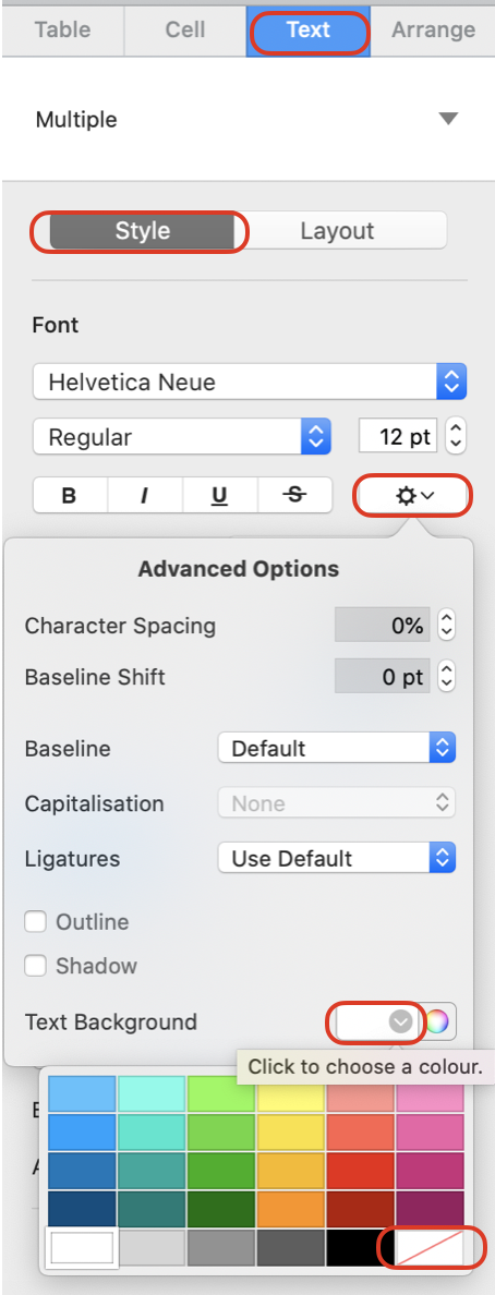 Format Inspector > Text > Style > Gearwheel (Advanced Options) > Text Background >Choose the background with a diagonal red line (No Fill).