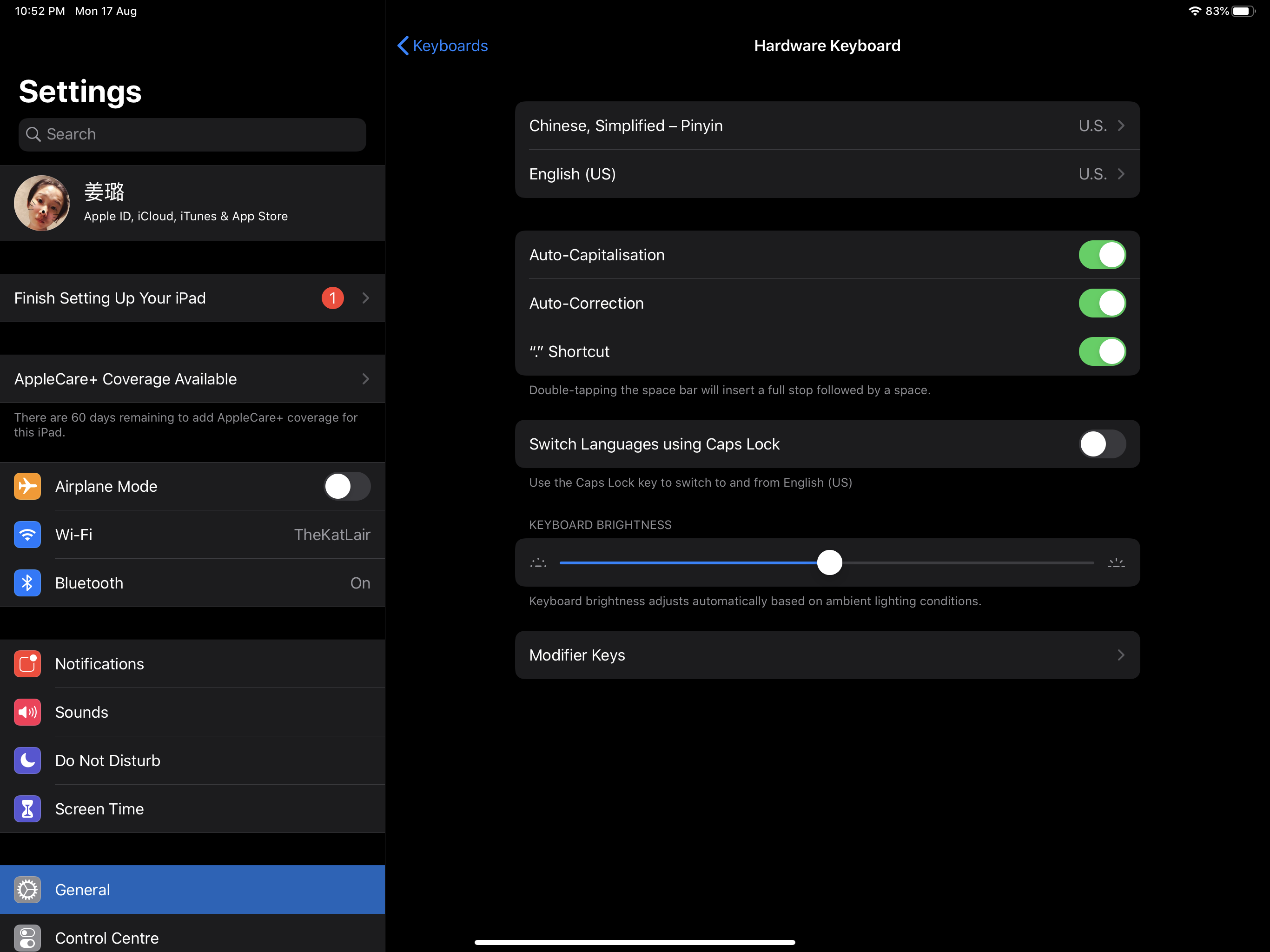 2) Certain 3rd party keyboard apps mess up the Caps Lock function for some reason. In this case there will normally not be any setting available in Hardware Keyboard to change, and the only fix is to get rid of the 3rd party keyboard. This is a bug somewhere in the app or in iOS.