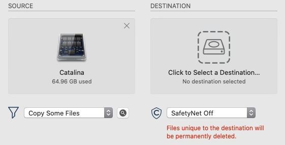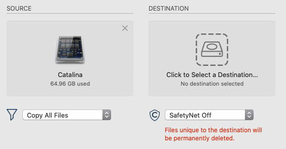 6) Choose the empty destination drive and start the cloning process. Do not try and use the Mac while the clone is being created. You don't want the contents of the drive to change at the same time CCC is trying to create an exact copy (minus the one folder).