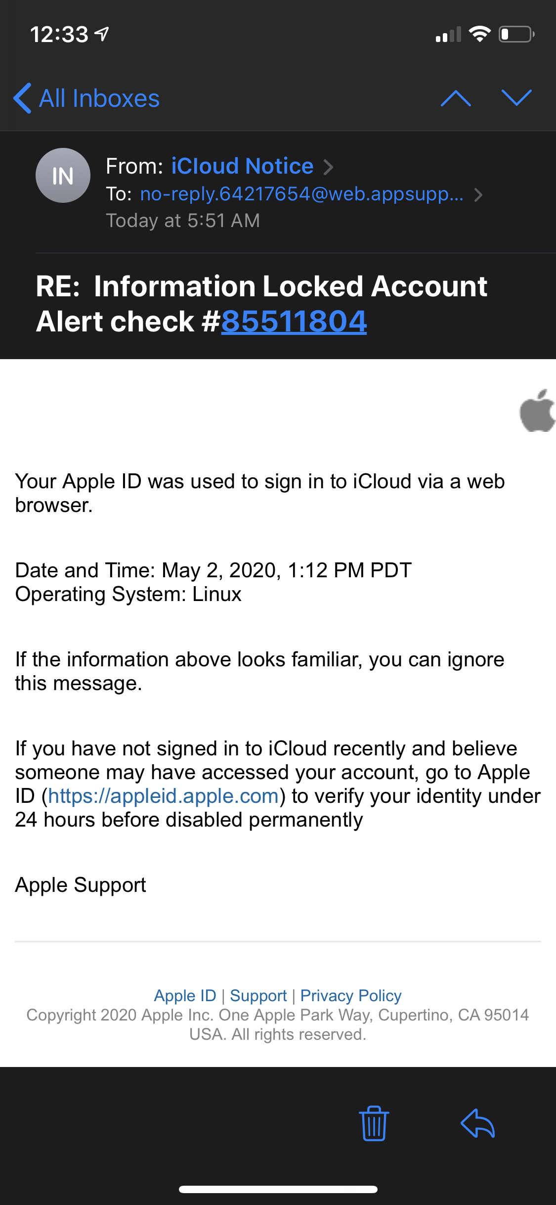 “Apple will always address you by your name or the name they have on file for you, not Dear Customer, Dear Client or by using your e-mail address. The e-mail will be from @apple.com or @iTunes.com. E-mail addresses can be spoofed. You can go to Mail/View/Message/Show all Headers to see more. Apple emails won't have poor grammar/misspellings. Apple e-mails will never contain an attachment. Apple will never request personal information by email such as Social Security numbers, your Mother’s maiden name or full credit card numbers. …