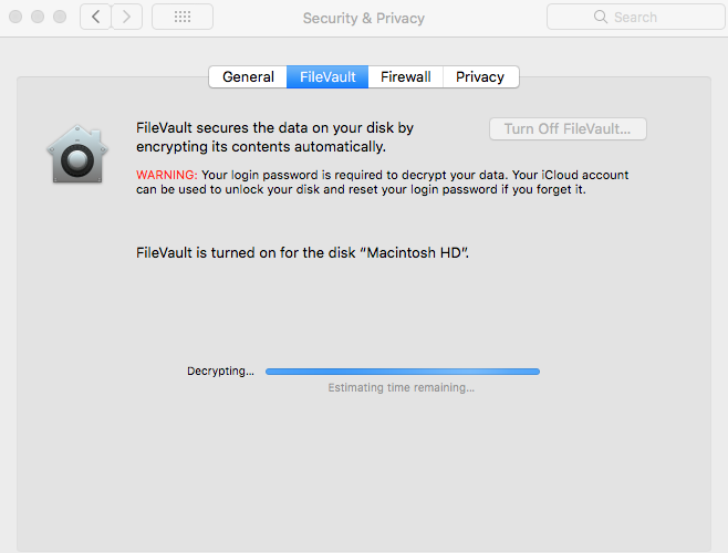 I've been enduring it for a while now and now when i try to check if its finished and if i can turn it off, the turn off button is greyed out and it claims to still be decrypting but it doesnt give me a time frame?