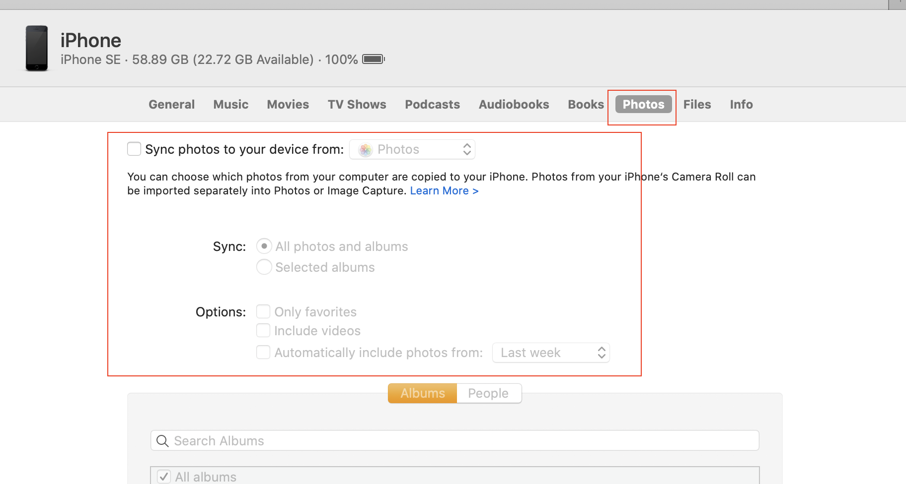I just bought a new Iphone and at my first attempt to Sync by plugging into my Mac, the Finder window has All Photos being backed up along with my whole music library, and I'm unable to stop it.