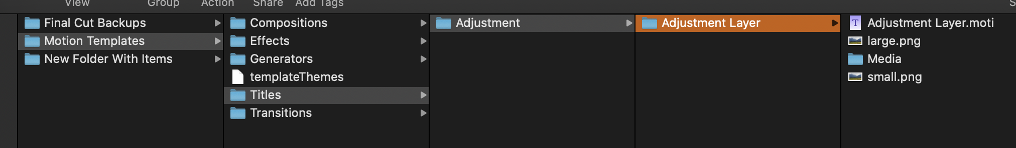 The adjustment layer web page says install in Motion Templates. This is the typical folder structure inside Movies.: