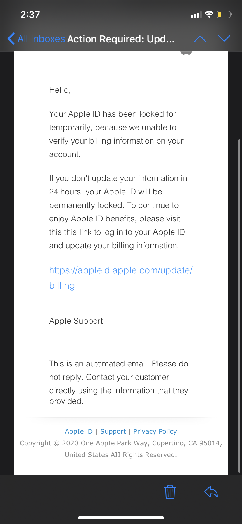 “Apple will always address you by your name or the name they have on file for you, not Dear Customer, Dear Client or by using your e-mail address. The e-mail will be from @apple.com or @iTunes.com. E-mail addresses can be spoofed. You can go to Mail/View/Message/Show all Headers to see more. Apple emails won't have poor grammar/misspellings. Apple e-mails will never contain an attachment. Apple will never request personal information by email such as Social Security numbers, your Mother’s maiden name or full credit card numbers. …
