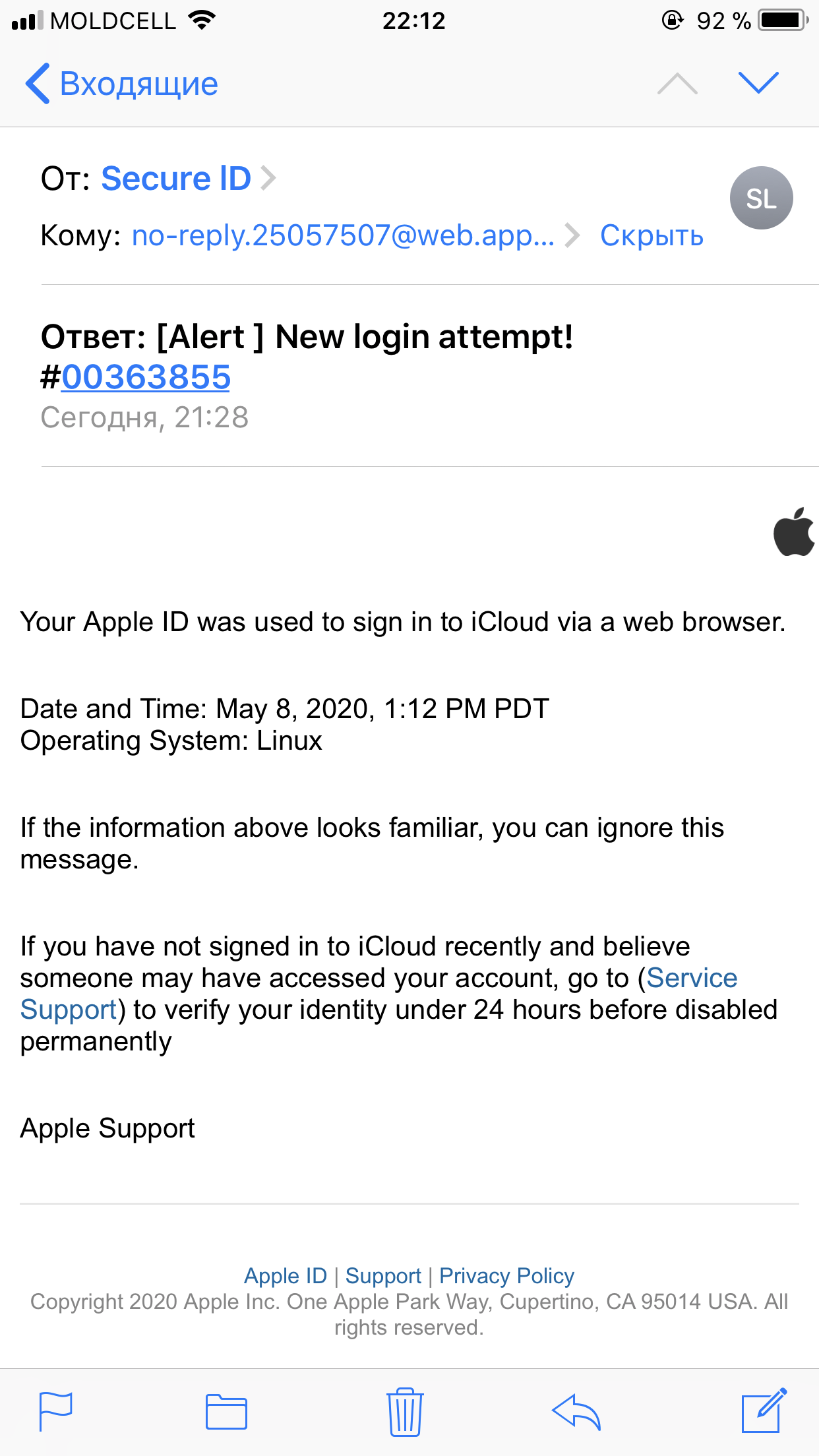 Today I received a strange email from Secure ID. But I understand that this letter is not from Apple. I received a similar letter for the second time. Are these scammers? screen photo of this letter here.
