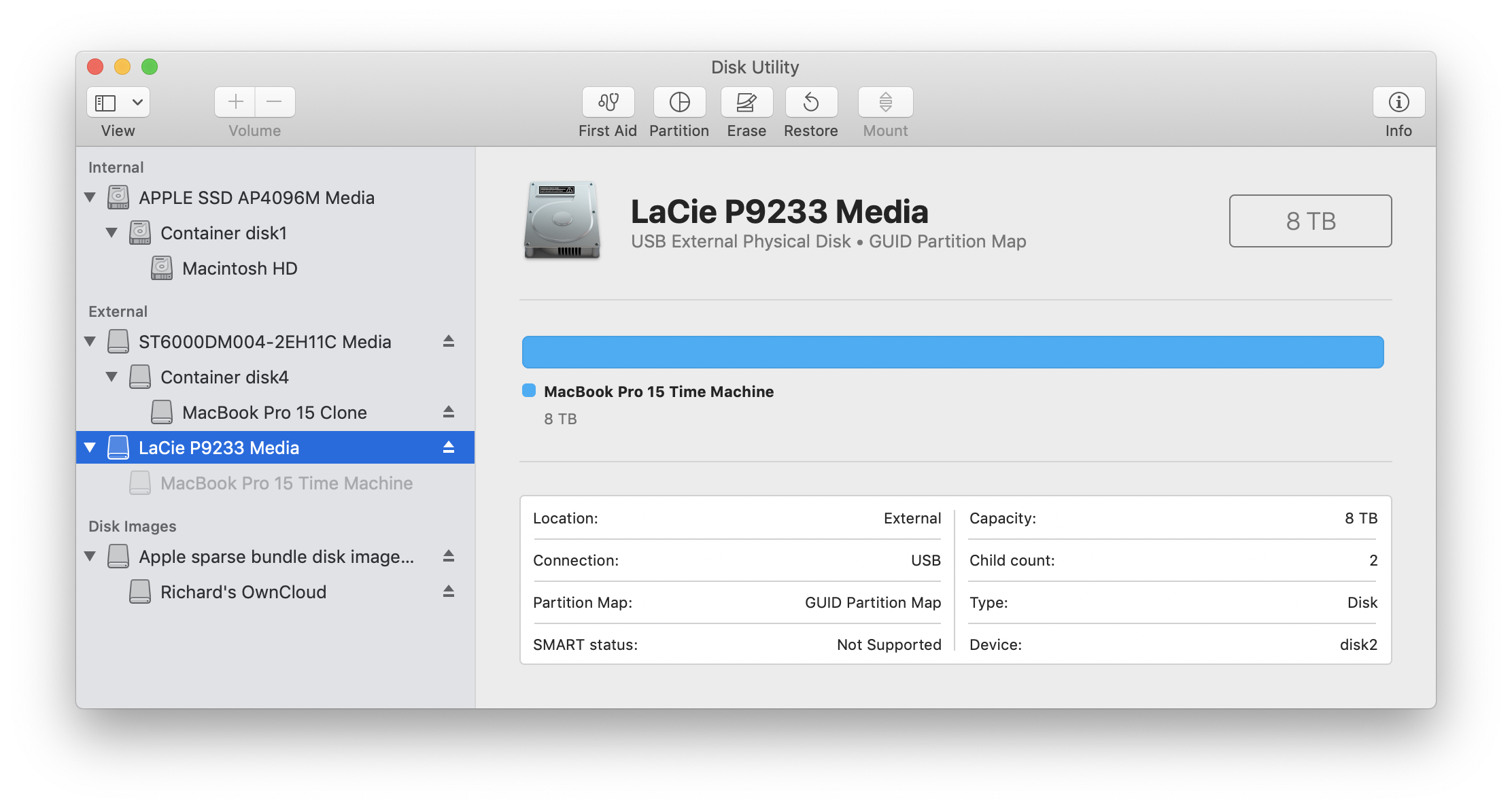 For the record, here are the specifications: MacBook Pro 15" 2018 model with Touch Bar, 32 GB RAM and 4 TB SSD running macOS 10.14.6 Mojave. The Time Machine disk is a LaCie P933 with 8 TB, purchased in Oct. 2018, just slightly after the MBP. It is connected to the MBP by USB-C.