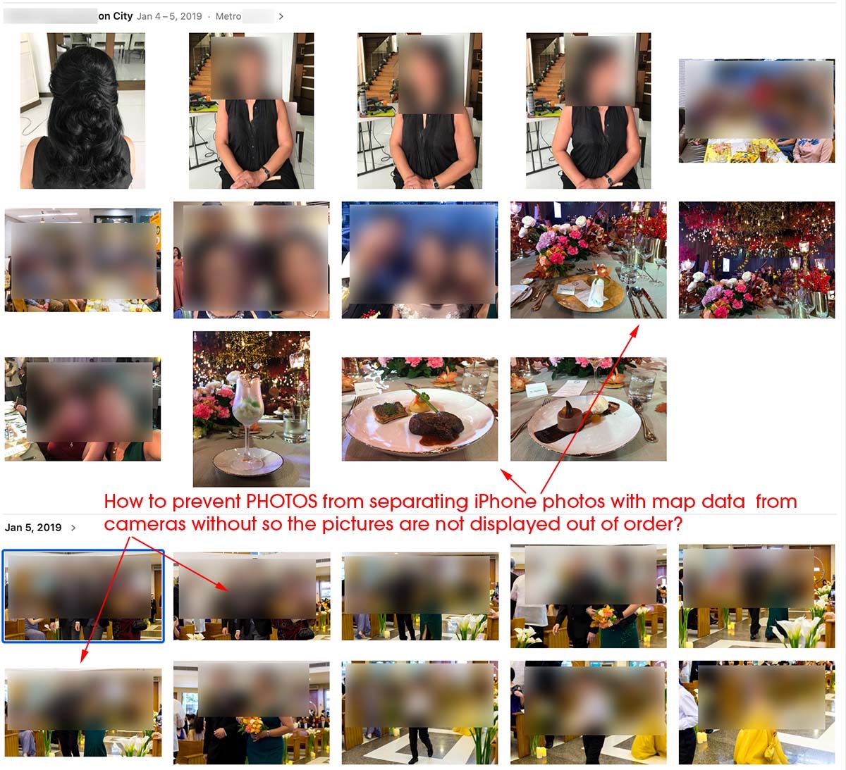 Photos app separates iPhone photos with map data from pictures taken by other cameras without map data. Now my pictures are DISPLAYED AND PLAYED out of order. How do I keep all of the photos in the correct order they are taken?