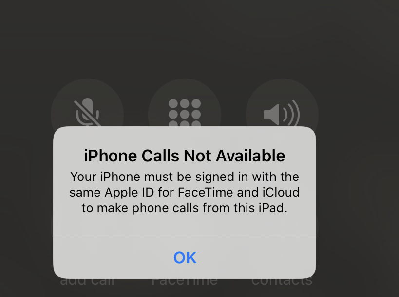 I can no longer make regular calls from my iPad. After checking all my settings and Apple IDs on my phone and iPad, I finally got the iPad to again receive calls that come in to my iPhones cell number (that took an hour of signing out and in). However, I can no longer make a call from the iPad. I can make and receive FaceTime calls - no problem. Outgoing calls on the iPad continue to get the error "iPhone Calls Not Available - Your iPhone must be signed in with the same Apple ID....." It is. I can't. Making me crazy.