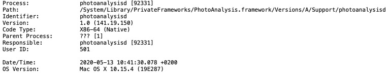 The report tells me that photoanalysisd crashed on trying to access my address book database file (AddressBook-v22.abcddb). It will restart the process automatically....