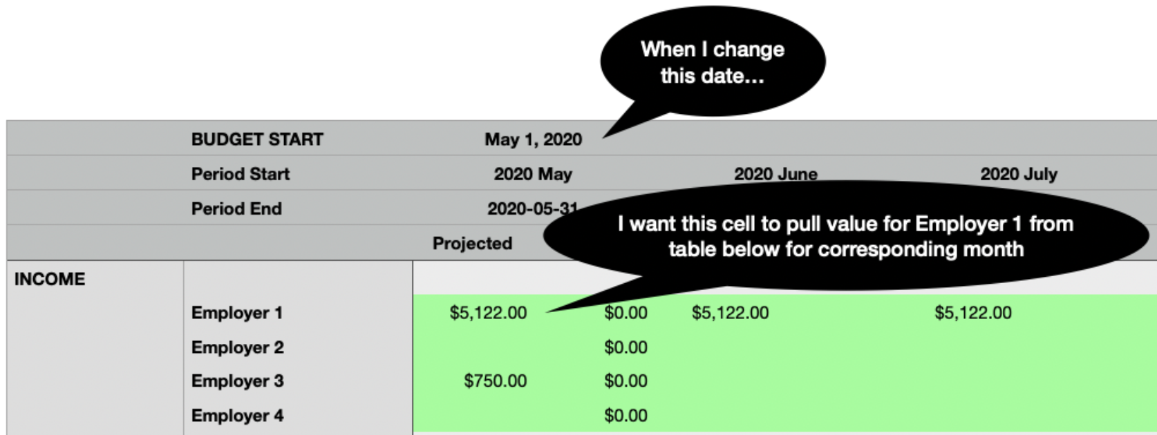 I have started a personal finance budget and have a "Master Projections" table, an "18-month Budget" table with projected vs. actual budget values, and a "Transactions" table. I want to keep the master ongoing so that I can create new and edit current monthly budgets as required. My "18-month Budget" pulls actual budget values from the "Transactions" table, but I would like the projected values to be pulled from my "Master Projections" table. I also have the "18-month Budget" set up so that I can select the start date and it will adjust to any 18-month period. Actuals is fine, however, I don't know how to compensate for the change in month for the projected values. The Lookup Function works for the employer, but unsure how to incorporate the month heading. They are set up as different sheets in my file, but I put them together in the attachment for ease of explanation. Thanks for any help :)