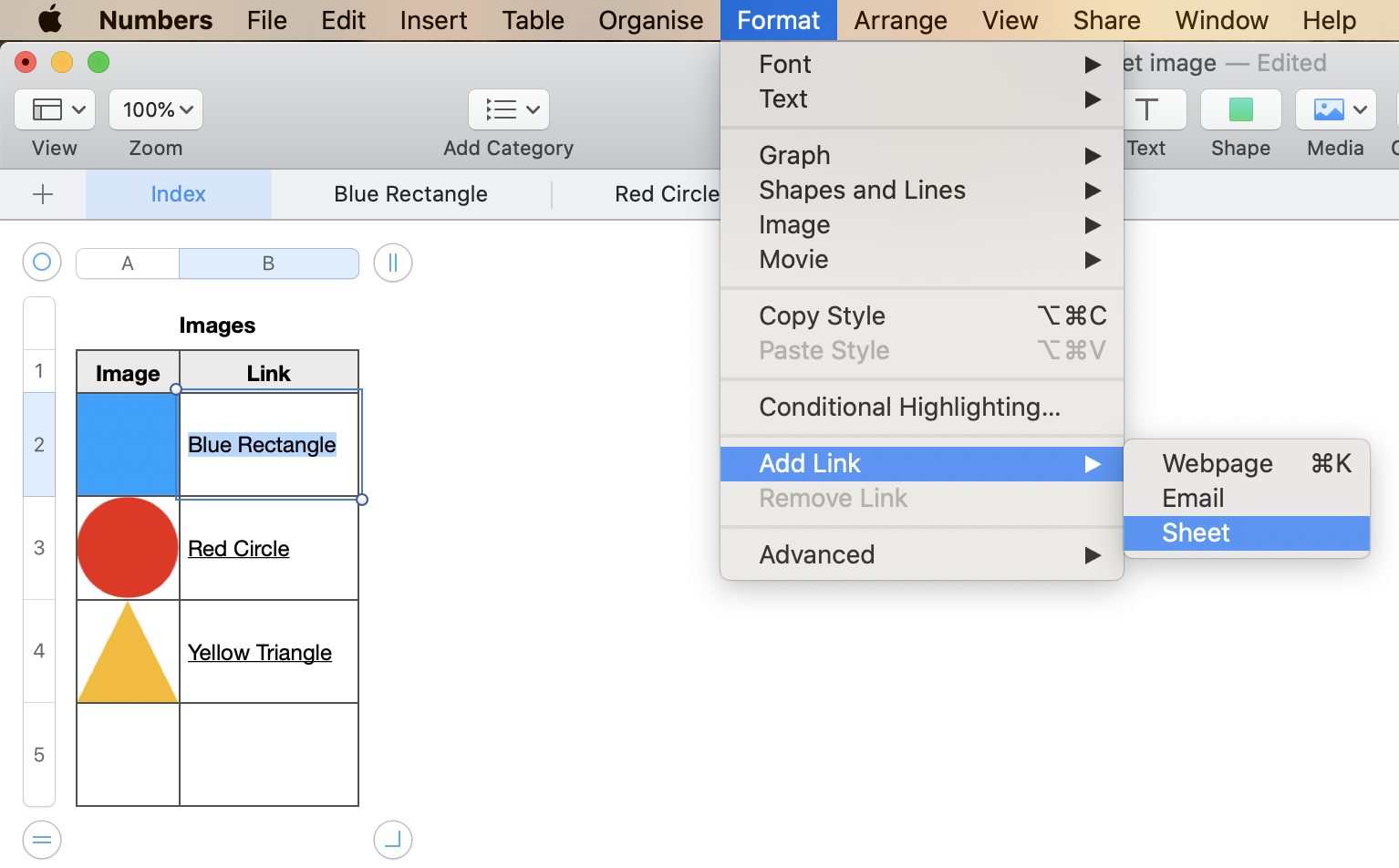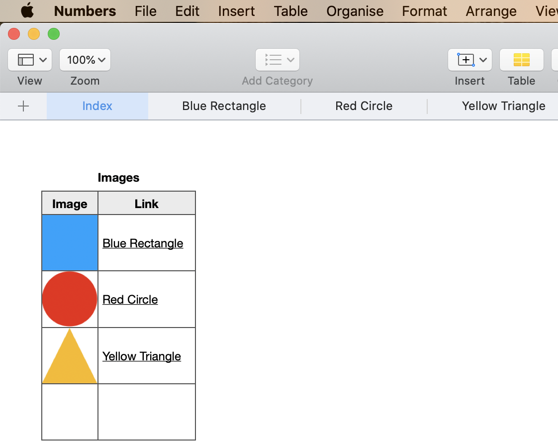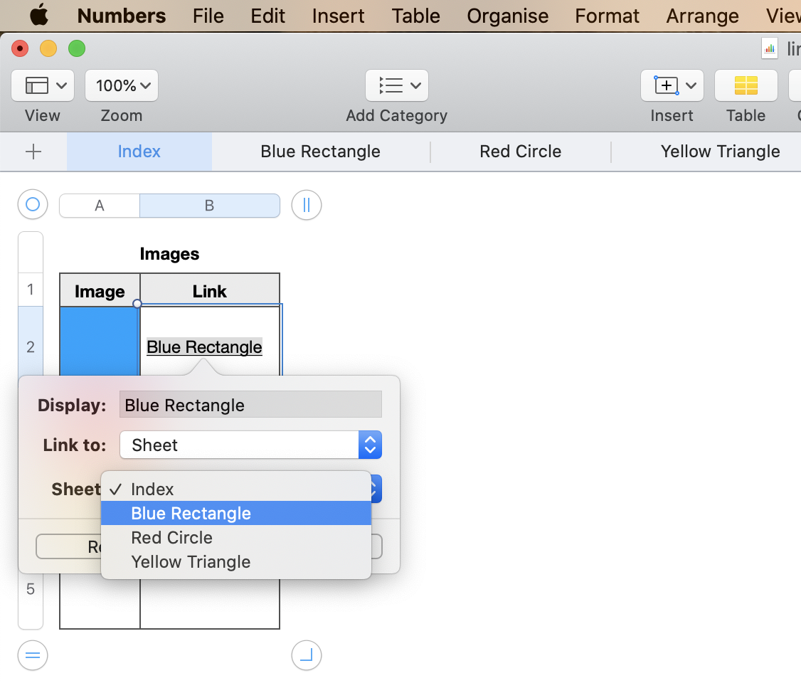 Im wondering if in Numbers or Pages; it's possible to create a hyperlink in a table cell that clicks through to an image on another sheet/page?