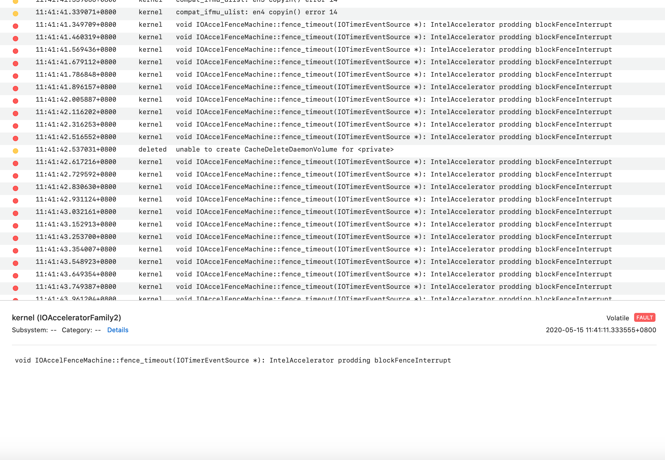 fault 11:43:05.855772+0800 kernel void IOAccelFenceMachine::fence_timeout(IOTimerEventSource *): IntelAccelerator prodding blockFenceInterrupt