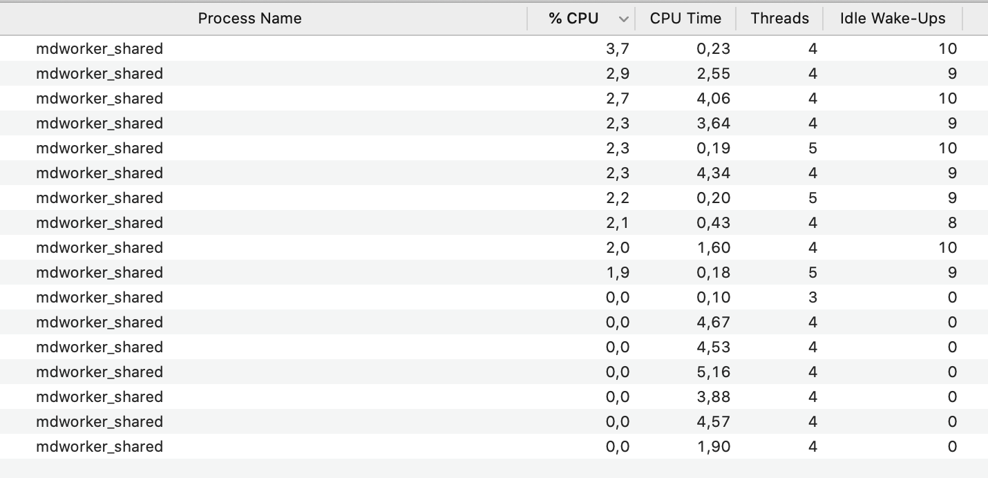 mds_stores is running the CPU high, while there are 20+ instances of mdworker_shared, each running a few per cent of CPU.