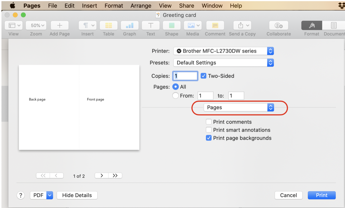 Barry and Yellowbox, you are a genius! All I had to do is change printer box to layout and short edge binding. Who would have thought! All this nonsense about duplex printer, etc. as one of the Apple consultants told me. thanks for all, Now I kept it as a template and can change pics and wording. Now this was for a FLIP CARD, hopefully it will be for a vertical card too???? (Like a regular greeting card in store??? Also what is a good paper card stock that won't jam the printer, an HP Envy Photo. What is best place to buy about 25 with envelopes? Amazon, Staples, Walmart?
