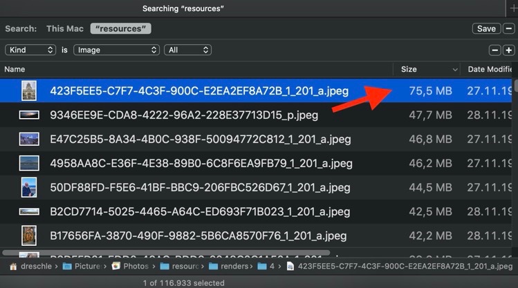 The largest files have all been edited in external editors. The "render" file on top has a whopping size of 75.5 MB, but the original in Photos is shown as a JPEG of just 2.2 MB.