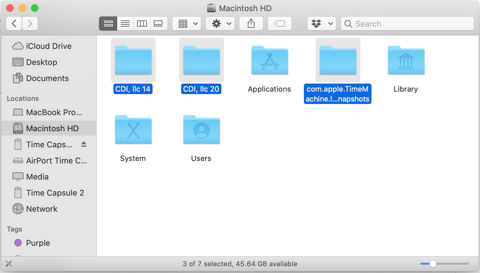 I have 3 folders that I am unable to remove. 2 have no folders underneath them and one looks like a reference to time capsule with many folders, but no content.