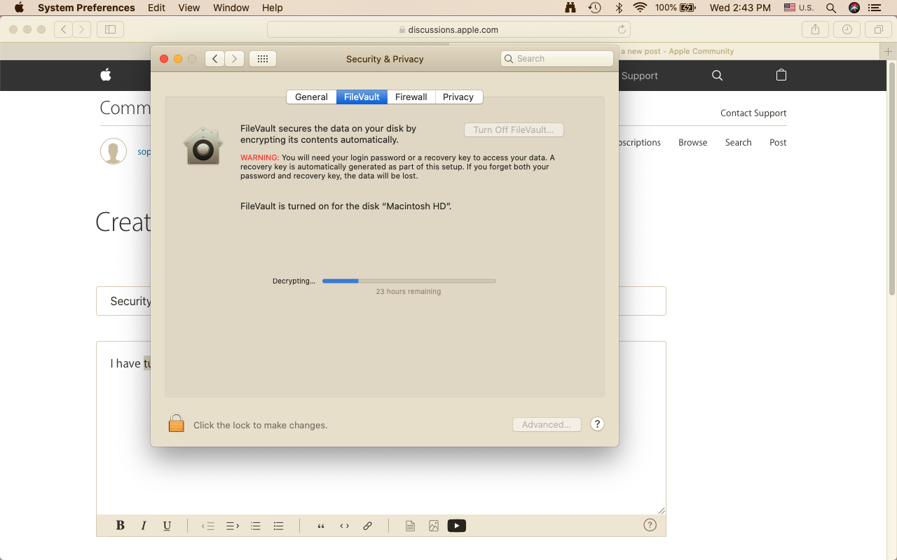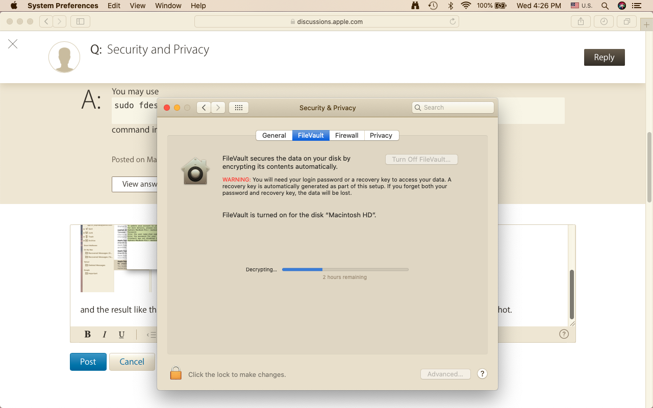 and the result like this. when I check my mac on Security and Privacy, the Decrypting still processing like screenshot.