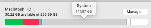 I bought a mac mini with 250GB but really, I only have 100GB usable storage. The manage option does not help as System is greyed out. Also there is a discrepancy, the below screenshot says 147 but under the manage panel it says 100GB.