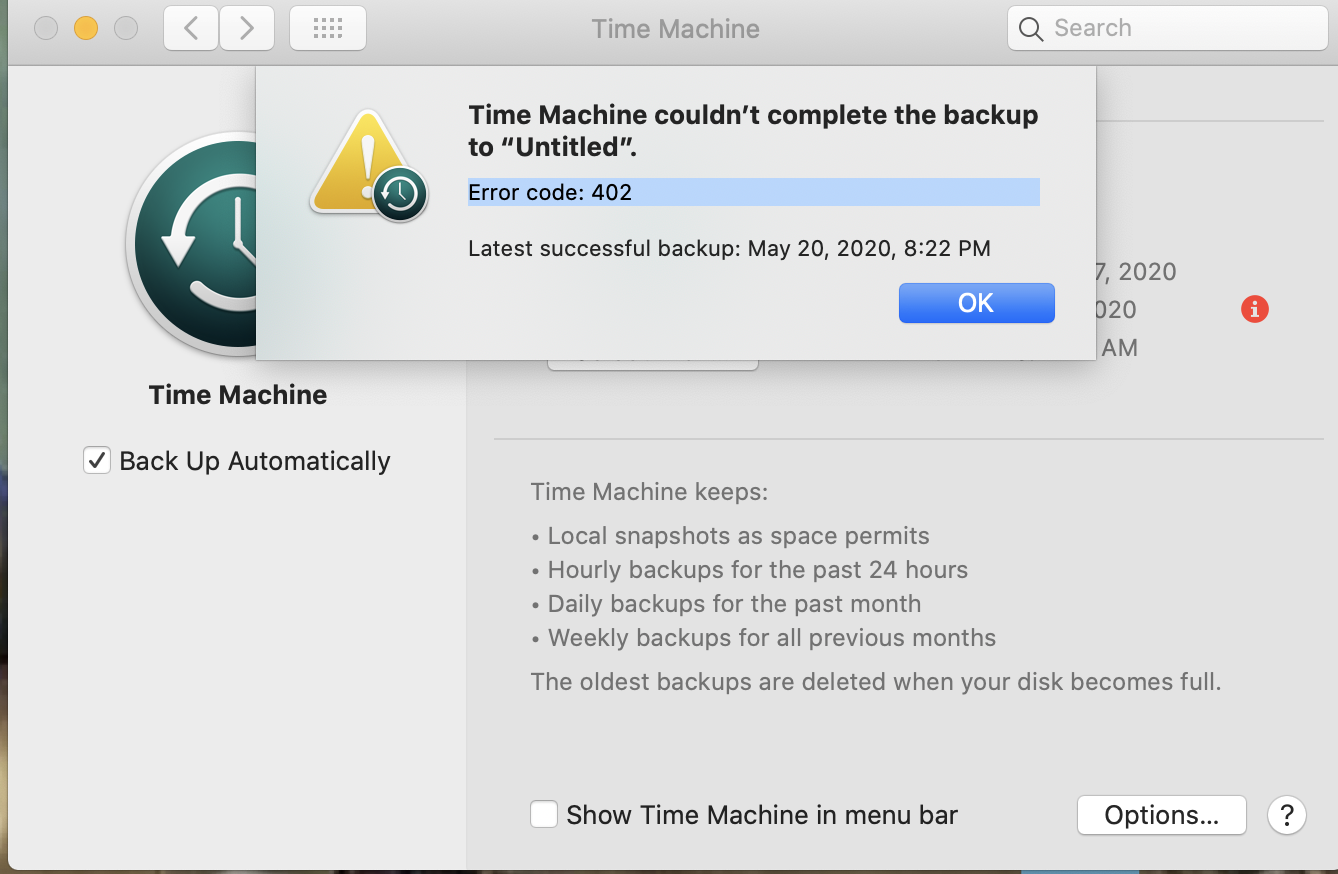 Time machine wont back up all of a sudden....Error 402 and encyrpiton issue?