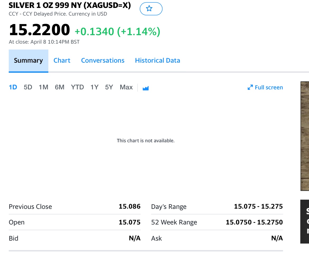 I should be able to use =CURRENCY(“XAG”,”USD”) to get silver spot price to appear. However, it’s giving me a number that is roughly $2.00 below that amount. A similar problem is appear for XAU, which is the symbol for gold spot price. I’ve looked at other options, like =STOCK(“SI=F”) but that’s basically useless because that’s silver futures and not spot price.