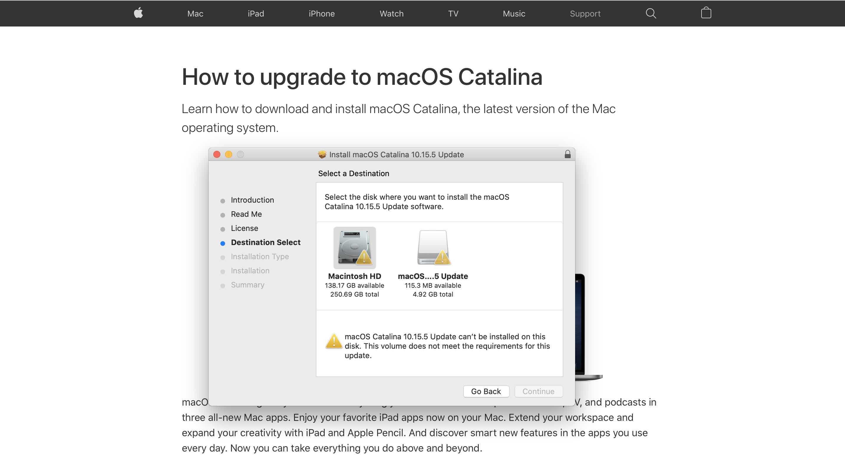 I can't install the Catalina 10.5.5 update either. I have a 2017 MacBook Pro with 138GB of space and when I try to install 10.15.5, I receive the message that it can't be installed on this volume: