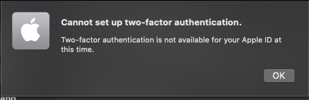 I'm currently using a MacBook Air, macOS 10.15 (Catalina) but i am unable to activate my Two-factor authentication. There's no clear error message and all i get is "Two-factor authentication is not available for your Apple ID at this time".