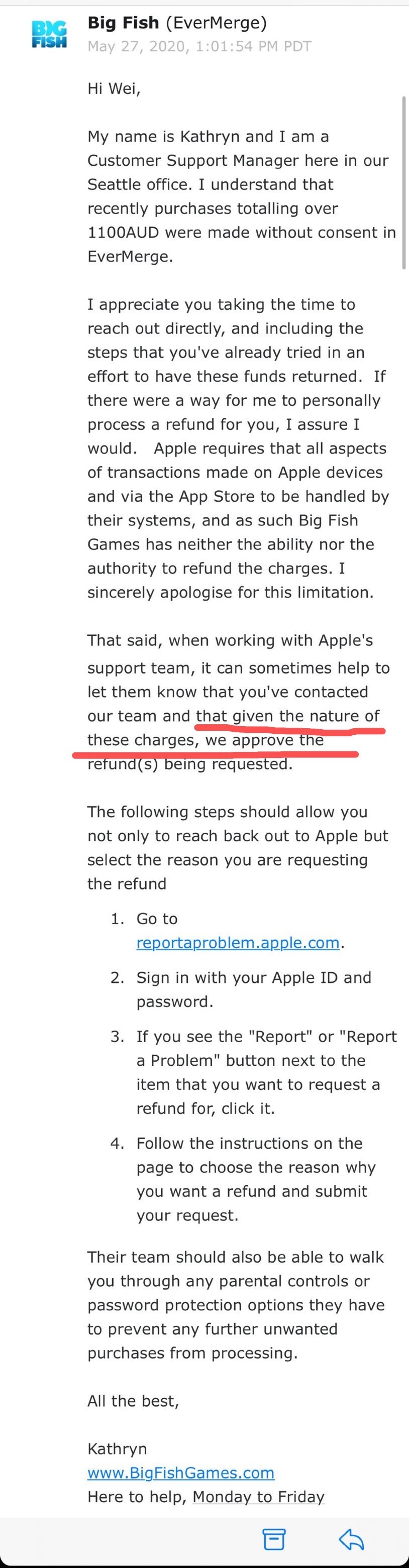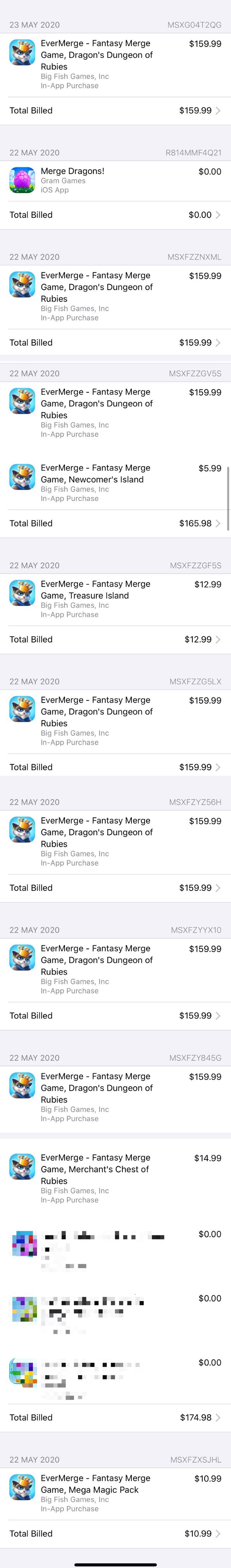 With ignoring supervision, our 5-year-old child spent shockingly $1164.89 a few days ago on EverMerge(a game). This huge bill was way too much for our family to afford during the very difficult time of COVID-19...We tried to ask for a refund from the EverMerge developer Big Fish, and they kindly approved the refund request and told me to make a refund claim through App Store”reportaproblem”function. They’d happy to approve my request, BUT they don’t have the authority to handle the order process in App Store.