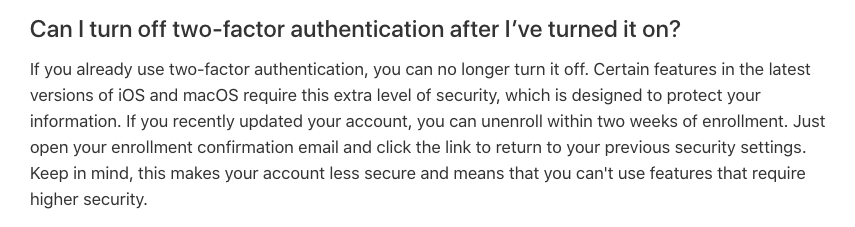 how to deactivate two face authentication? i tried to go icloud press my name setting and security and there is no choice of on and off