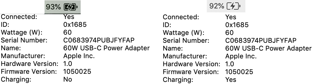 When using on 100% charge at any random time the battery charge indicator will show the charge declining with the indicator blacked out. The System Report (power) states connected:yes and charging:no. It continues to drop charge to 91% and then changes to the white indicator and recharges to 100% and System Report (power) states connected:yes and charging:yes. I have original and spare adaptors with same results. Turning charging on/off and resets do not seem to have any effect. I have Apple Care so I hope for a solution before 1/22.