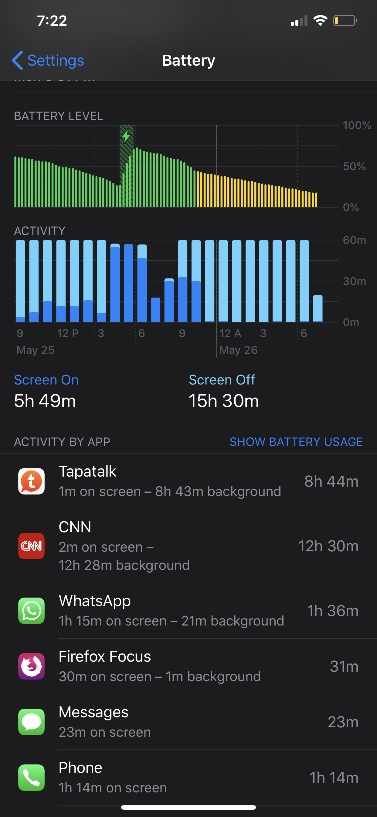 Interesting. When did you notice the problem? Because at first I thought it was just one app but I can tell you right now. It’s not ONE app, so deleting the ESPN app won’t solve the issue. Look at CNN and Tapatalk. There are others you can’t see, for example Weather Channel 37hours 9 minutes of background use. MarketWatch 32:28, Investing.com 17:03, etc. By the way, the onscreen usage is always 1,2,3,4 minutes. At the moment I am testing closing the apps manually after using them. Which is incredibly tedious. But it does appear to work. Will let you know if it does once I confirm it. Probably tomorrow.