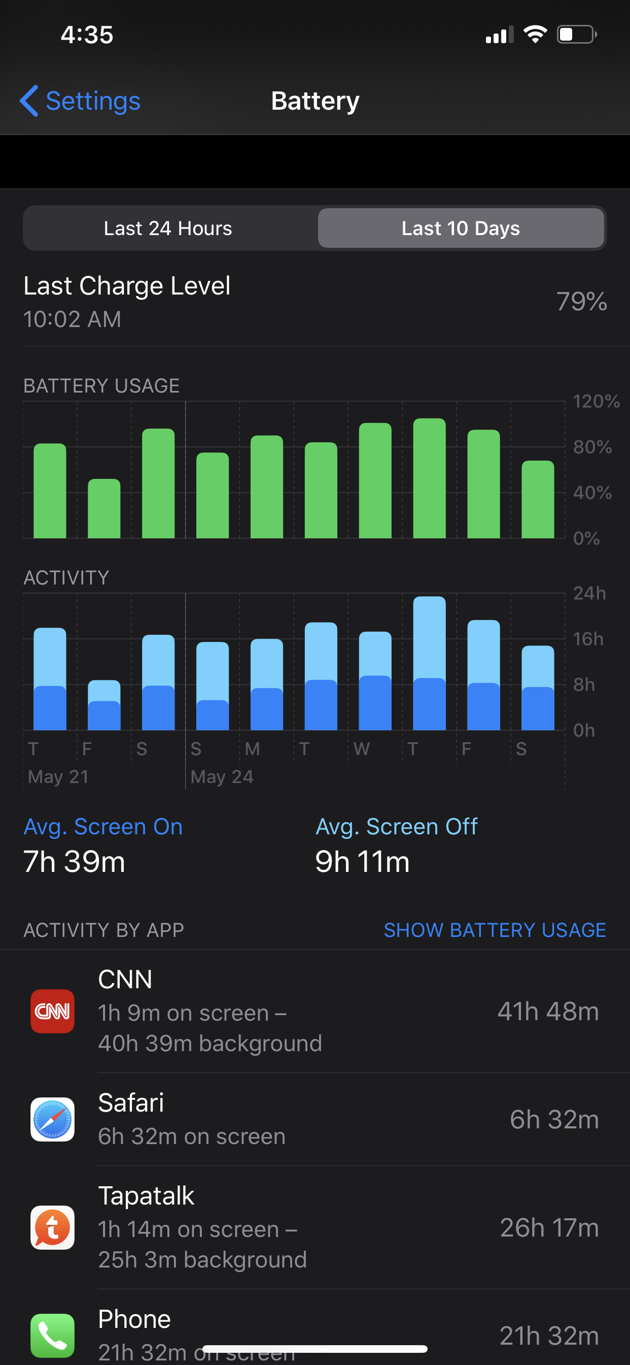 We will see what happens. I have double checked apps and some of the offending apps have been updated for 13.5. Or at least, they received updates after the release. Others haven’t. Anyway, I’ve been closing all the 3rd party apps and leaving the Apple apps only and it seems to be working. Here is a picture of the battery consumption graph which I think speaks for itself. I will keep monitoring the issue and report back any findings. You are absolutely correct in saying that doing this is a big inconvenience, especially since it is something that we are NOT accustomed to doing. Also Keep in mind that it is something that Apple itself does not want us to do, and has mentioned it several times over the years (continuously close apps manually). But the alternative is that not doing this WILL degrade your battery faster that normal usage. Which is what I’m trying to prevent. I hope somebody, somewhere, says something about this and the problem is fixed. I spoke to a friend las night and he seems to be having the same problem with his iPhone 11 Pro Max.