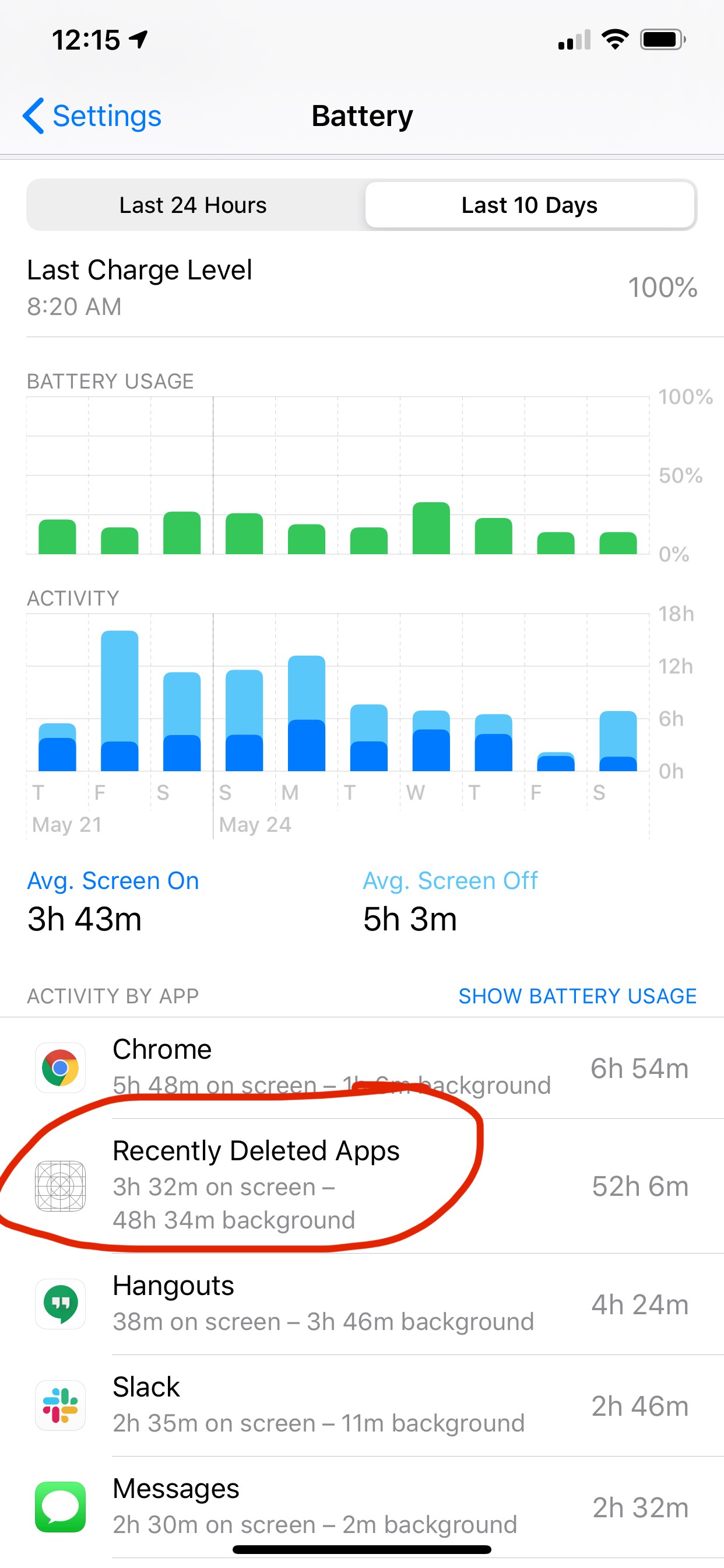 "Recently deleted app" is ESPN. I had background refresh - for that app - turned OFF. See the background usage? Crazy.