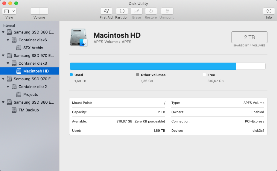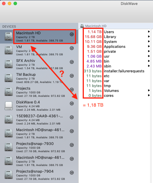 I just checked the available storage on my main drive and was surprised about how little space I have left. So I investigated where this was coming from. But the numbers don't add up. This is what Disk Utility says: