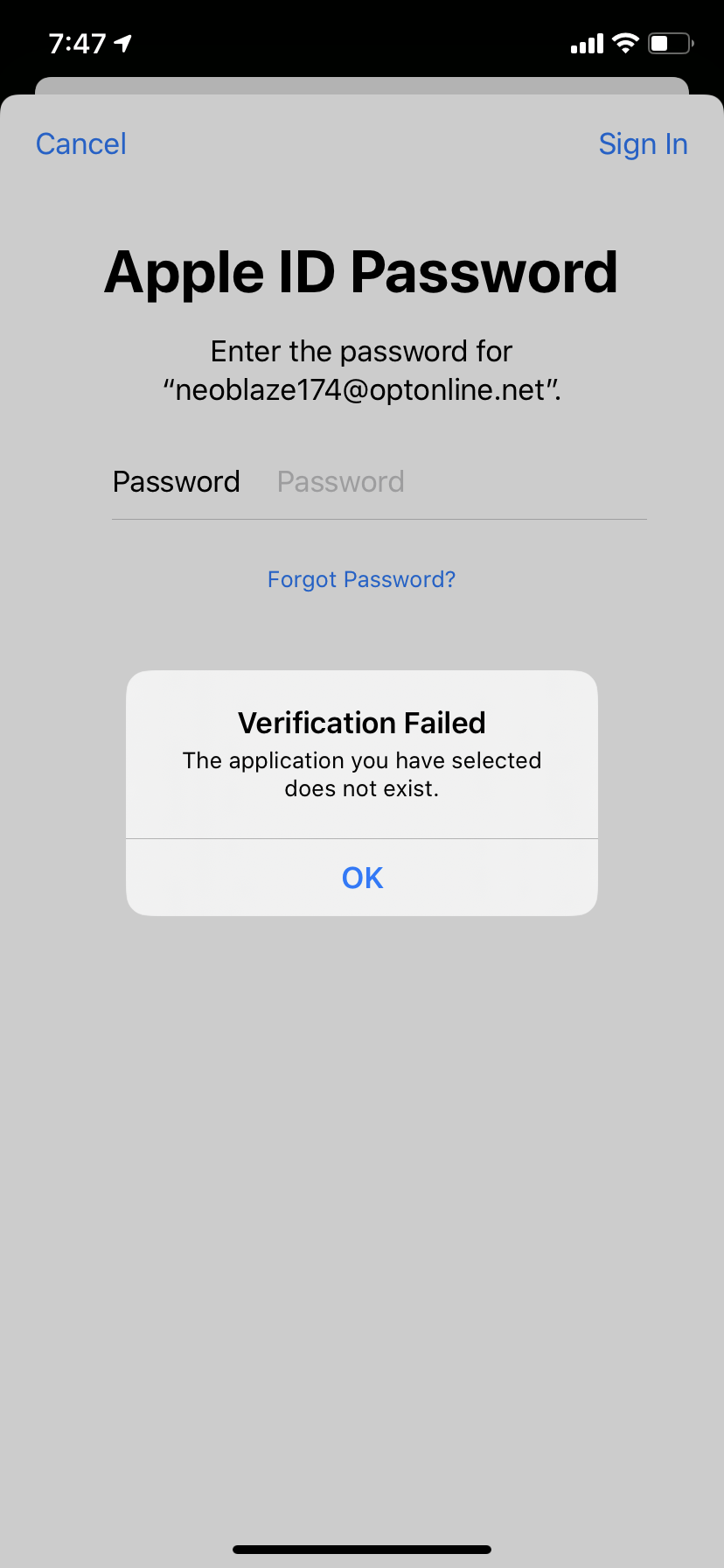 I keep getting an error when trying to log into my Apple ID saying “verification failed, The application you have selected does not exist”