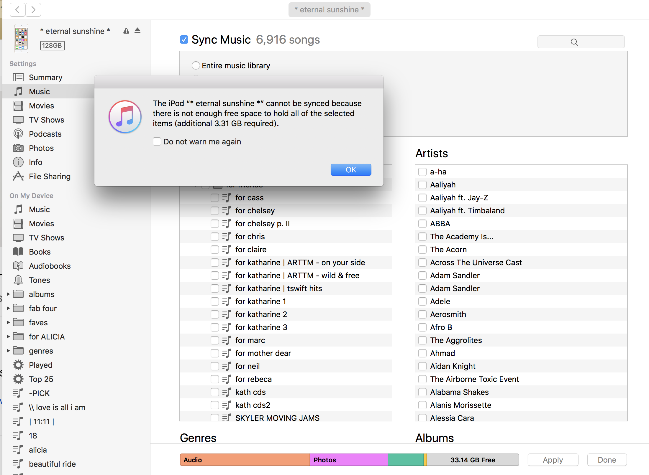 Anyway, my ipod touch has 128 gb capacity. It's showing 34 gigs left, yet when I got to sync a selection of new songs... it says "you need additional 3 gigs"...