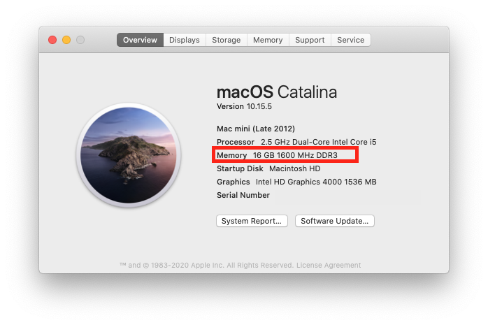 Where is the Ram count in MacMini. I've looked in "About this Mac," the Activity Monitor and the word just isn't there. I'm trying to find out what's wrong with my Mac, why it's so slow.
