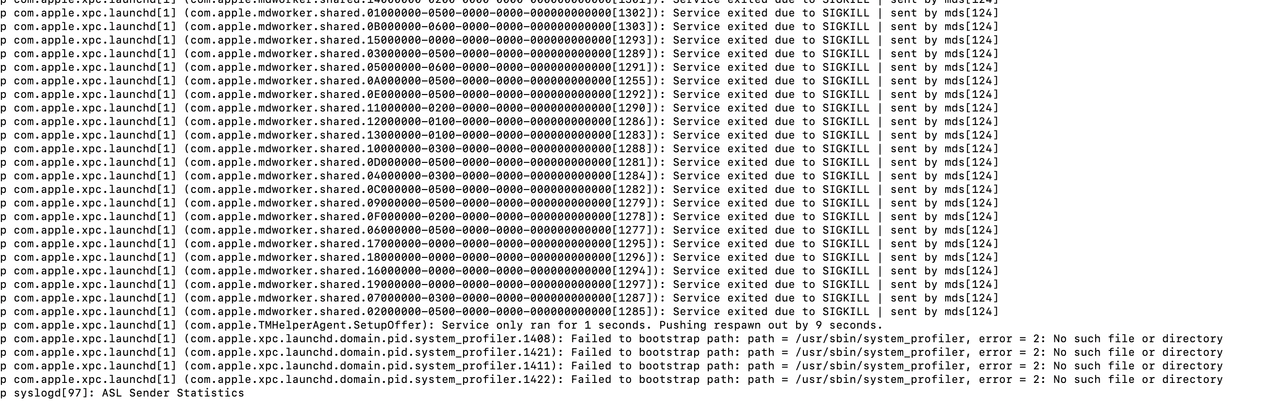 Jun 5 16:57:48 [MY MAC NAME] com.apple.xpc.launchd[1] (com.apple.mdworker.shared.0E000000-0400-0000-0000-000000000000[2326]): Service exited due to SIGKILL | sent by mds[168]