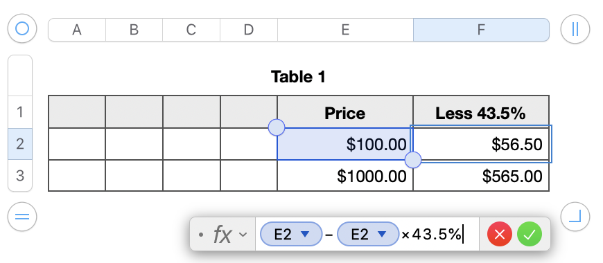 I have in column E a column of prices. I want to create in column F those prices less a percentage of 43.5%.
