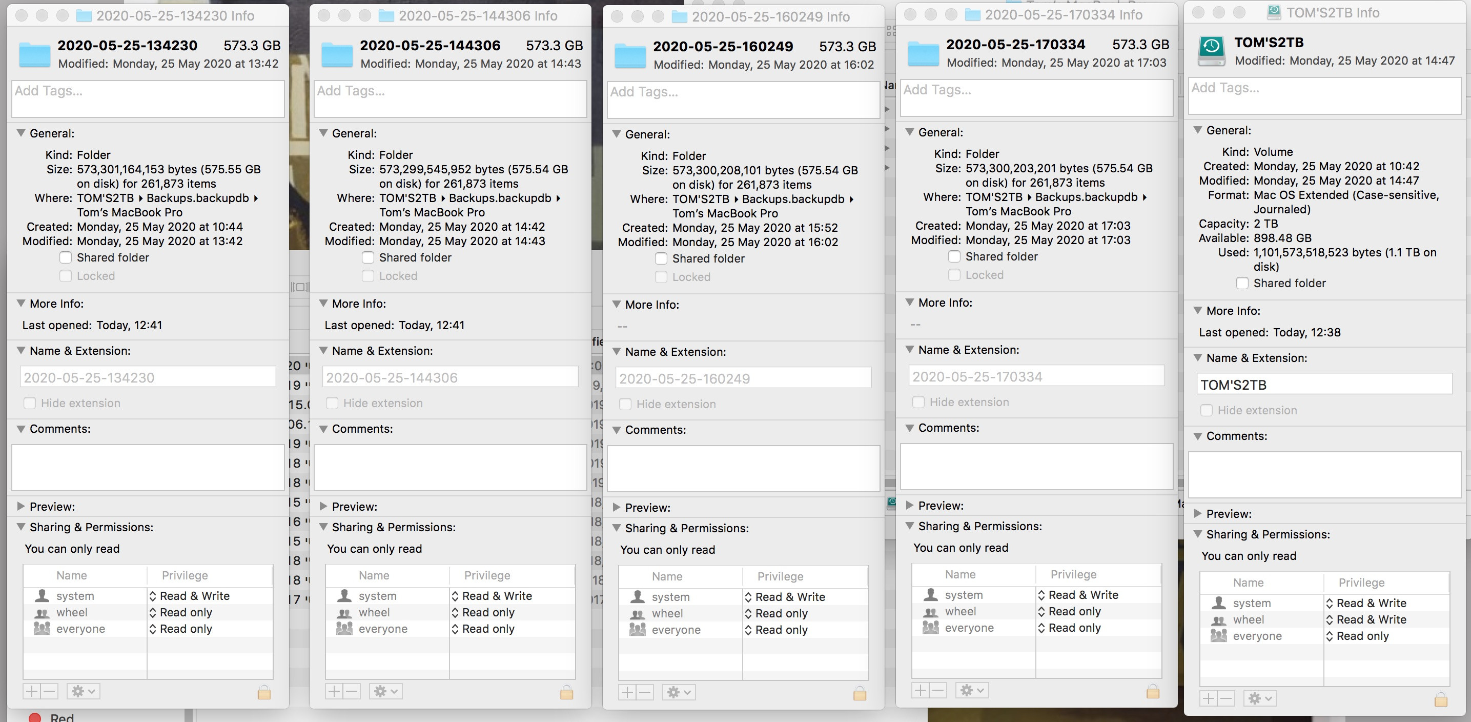 I just recently started using Time Machine. I was wondering what is actually being copied every time a backup runs. To figure this out I checked the folder size of every backup to date, expecting the first one to be by far the largest (about the size of all the content on my mac) and the others to be quite small, reflecting the minor changes in my data from backup to backup. However, as you can see in the screenshot below, this is not what "Get Info" says. According to this check it seems every single backup is about as big as the entire content of my mac. This is actually impossible, as you can see on the right that the hard drive where the backups are stored isn't big enough to contain this much data, let alone with about 800GB of free space to spare. So what's going on here?