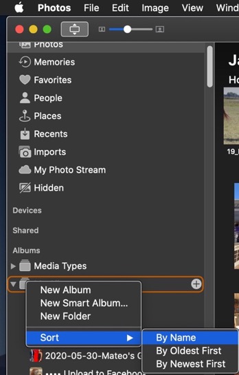 Under 'My Albums' in Photos, is it possible to sort all albums, sub folders/albums and photos by name?
