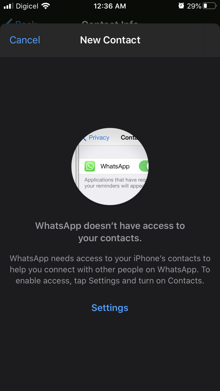 Hi! I was trying to increase storage space on my phone. I didn’t change any settings however my contacts are no longer synced to my WhatsApp. When I go to privacy there’s no indication that WhatsApp has requested access to my contacts either. Also, access to contacts via my Phone Dial Pad is no longer available
