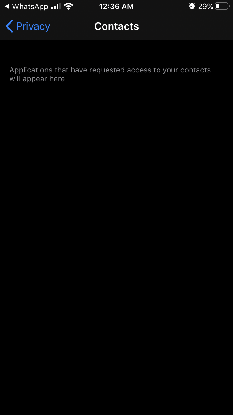 Hi! I was trying to increase storage space on my phone. I didn’t change any settings however my contacts are no longer synced to my WhatsApp. When I go to privacy there’s no indication that WhatsApp has requested access to my contacts either. Also, access to contacts via my Phone Dial Pad is no longer available