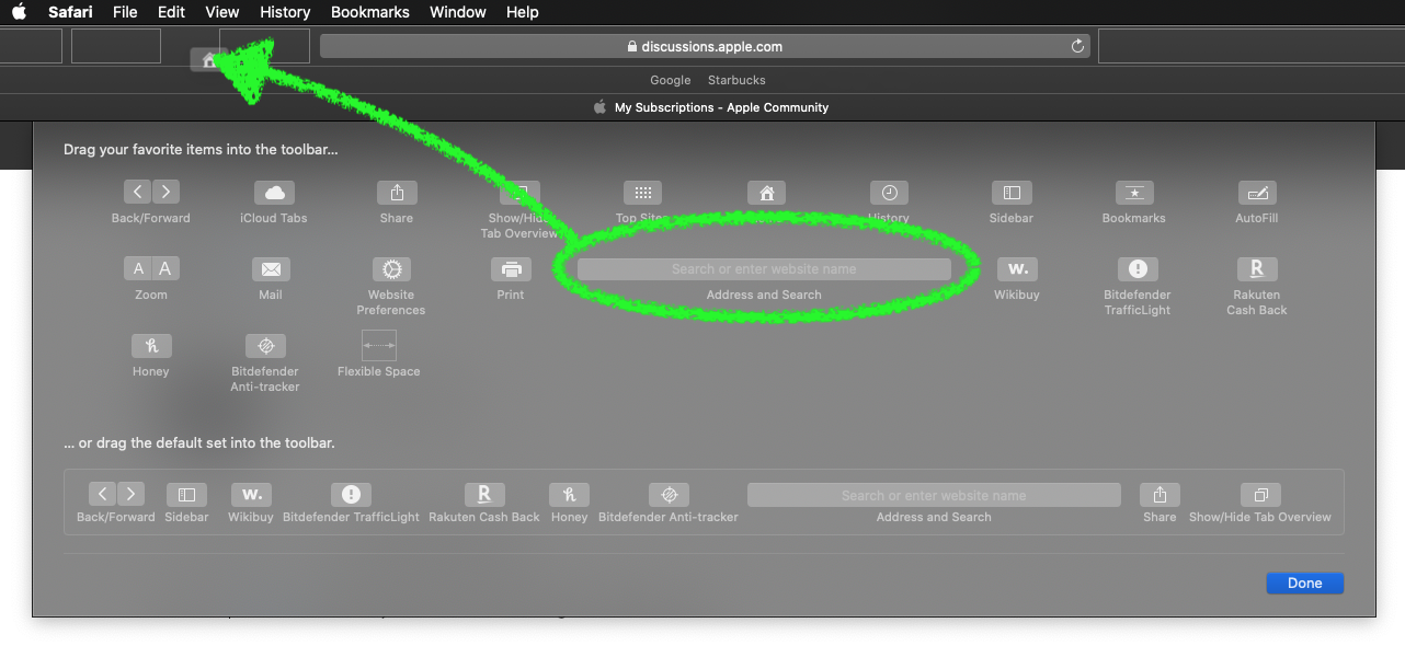 A drop-down window will appear showing you all the tools you can modify. If you just need the URL Smart Search box, grab it with your mouse cursor and place it wherever you'd like. There's lots of choices. Otherwise for easiness, you can just drag the default set back into your tool bar and start over.
