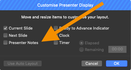 How do I hide presenter notes when presenting a keynote presentation on Zoom