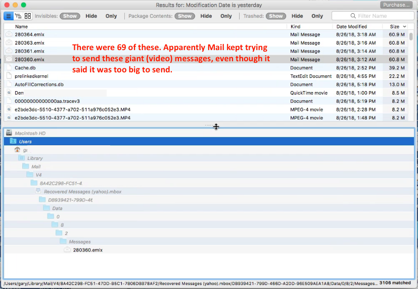 A couple years ago, when this first happened, I discovered several dozen copies of a huge message Mail tried and failed to send, over and over again, so maybe that's what's happening every time. (There was a video attached to those — he didn't know any better — see screenshot below.) But why would Mail get stuck like this so often?