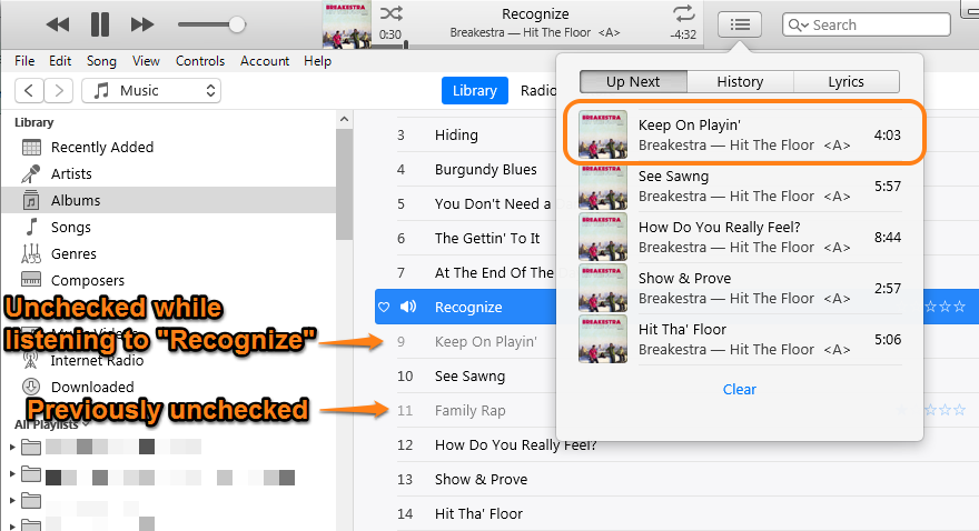 However - let's start the album playing with the song Recognize. Once you start something playing, this populates the Up Next list, which in this case will have the tracks numbered 9, 10, 12, 13 & 14 in it. If you uncheck the song Keep On Playin' (track 9) while the playlist is running, it remains in the Up Next list and therefore, it will play.