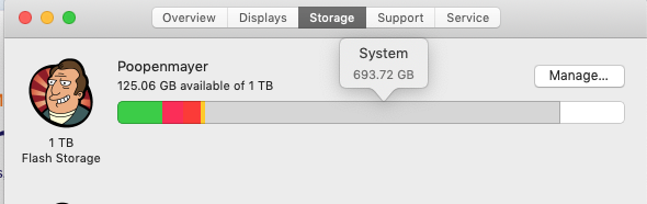 My 1 TB ssd shows as 875 GB used, almost 700 GB as 'system files'. When I look at the actual top level directories on the drive (Applications, Library, System and Users, added together) it's got about 310 GB actually used.