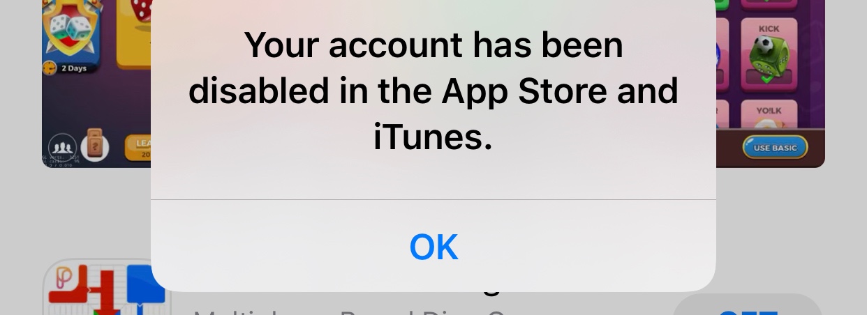 "If you see a message that says "Your account has been disabled in the App Store and iTunes," there might be a problem with the payment method that you have on file. When you see the message, don't try to edit any of your account information. Instead, contact Apple Support for help."